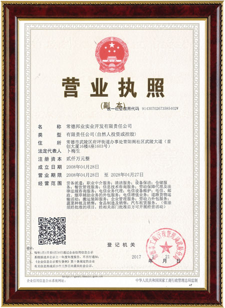常德邦業(yè)實業(yè)開發(fā)有限責任公司(原名常德市邦業(yè)人力資源開發(fā)有限責任公司)是經(jīng)湖南省人力資源和社會保障廳核準備案,常德市人力資源和社會保障局批準,常德市工商行政管理局登記注冊的一家綜合性人力資源服務型企業(yè)。公司成立于2008年4月28日,注冊資本2000萬元。